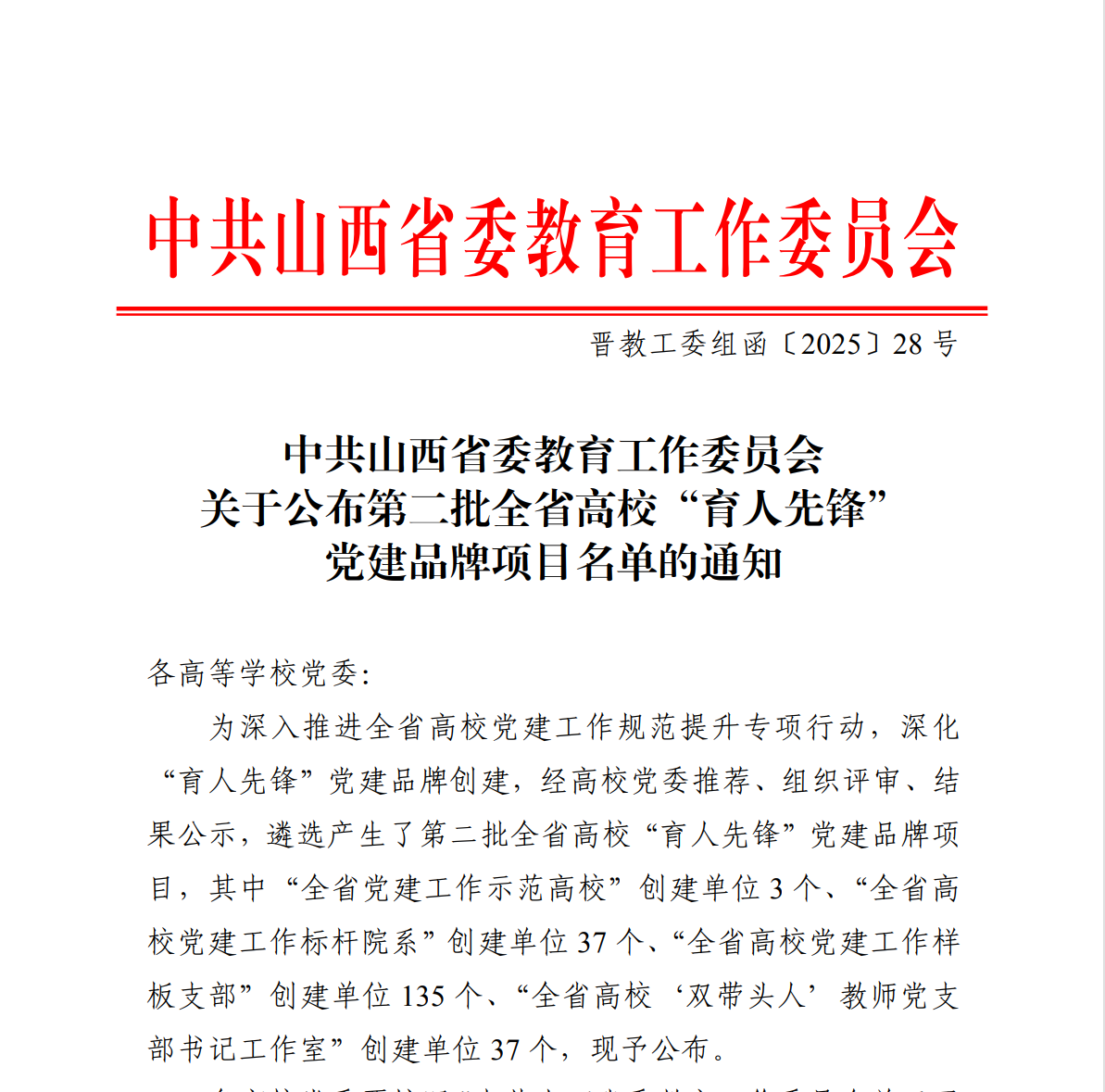 截止目前,学院获批山西省高校首批“双带头人”教师党支部书记工作室1个、全省高校“育人先锋”党建品牌项目“全省高校党建工作样板支部创建单位”2个,获批学校首批“全校党建工作标杆院系”培育创建单位1个、首批“全校‘双带头人’教师党支部书记工作室”培育创建单位1个,学校“先进基层党组织”3个、学校“优秀党建品牌”1个、学校“五星级党组织”2个。