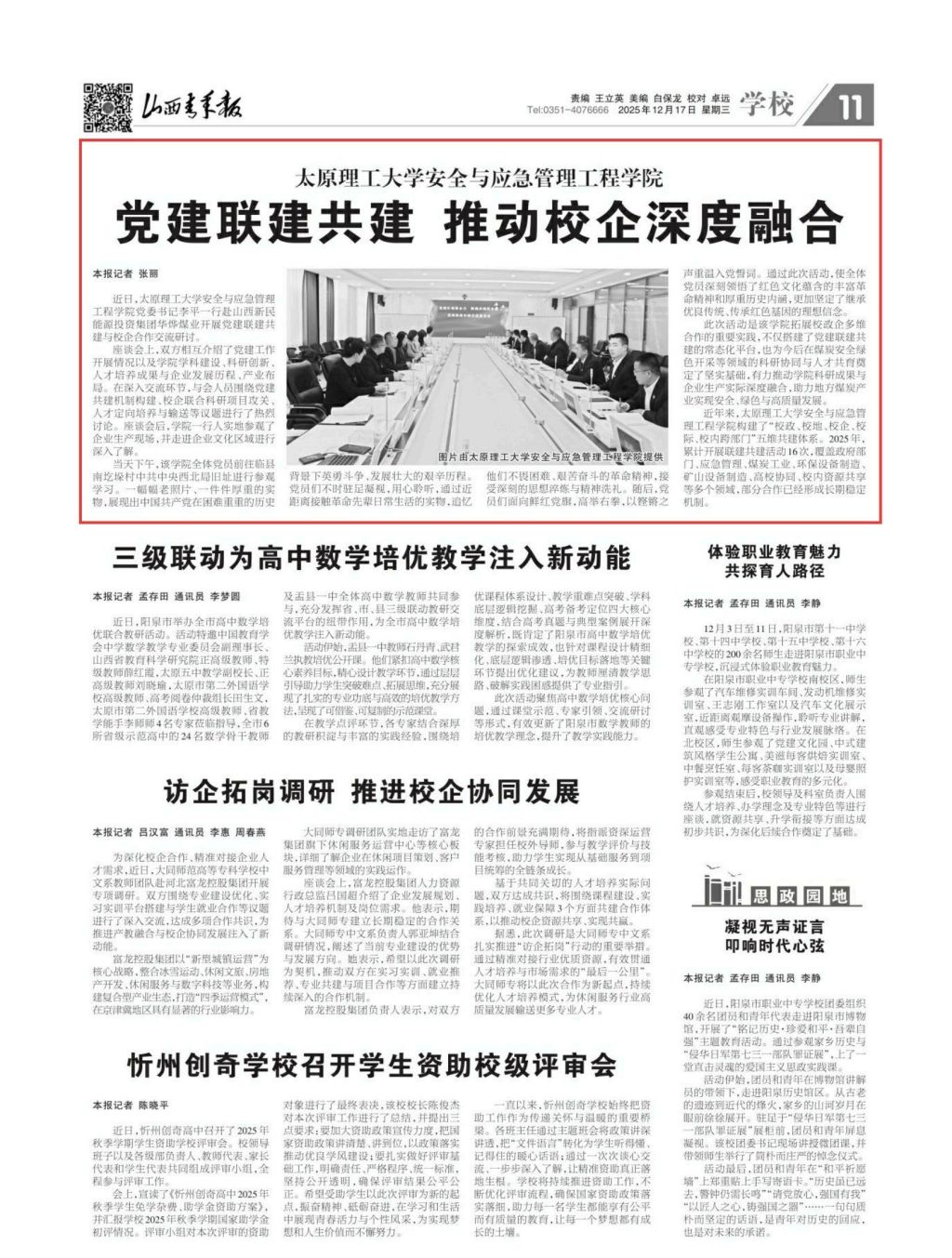 12月17日,《山西青年报》以《党建联建共建 推动校企深度融合》为题对威尼斯vip官网党建工作进行深度报道。现将全文转载如下。