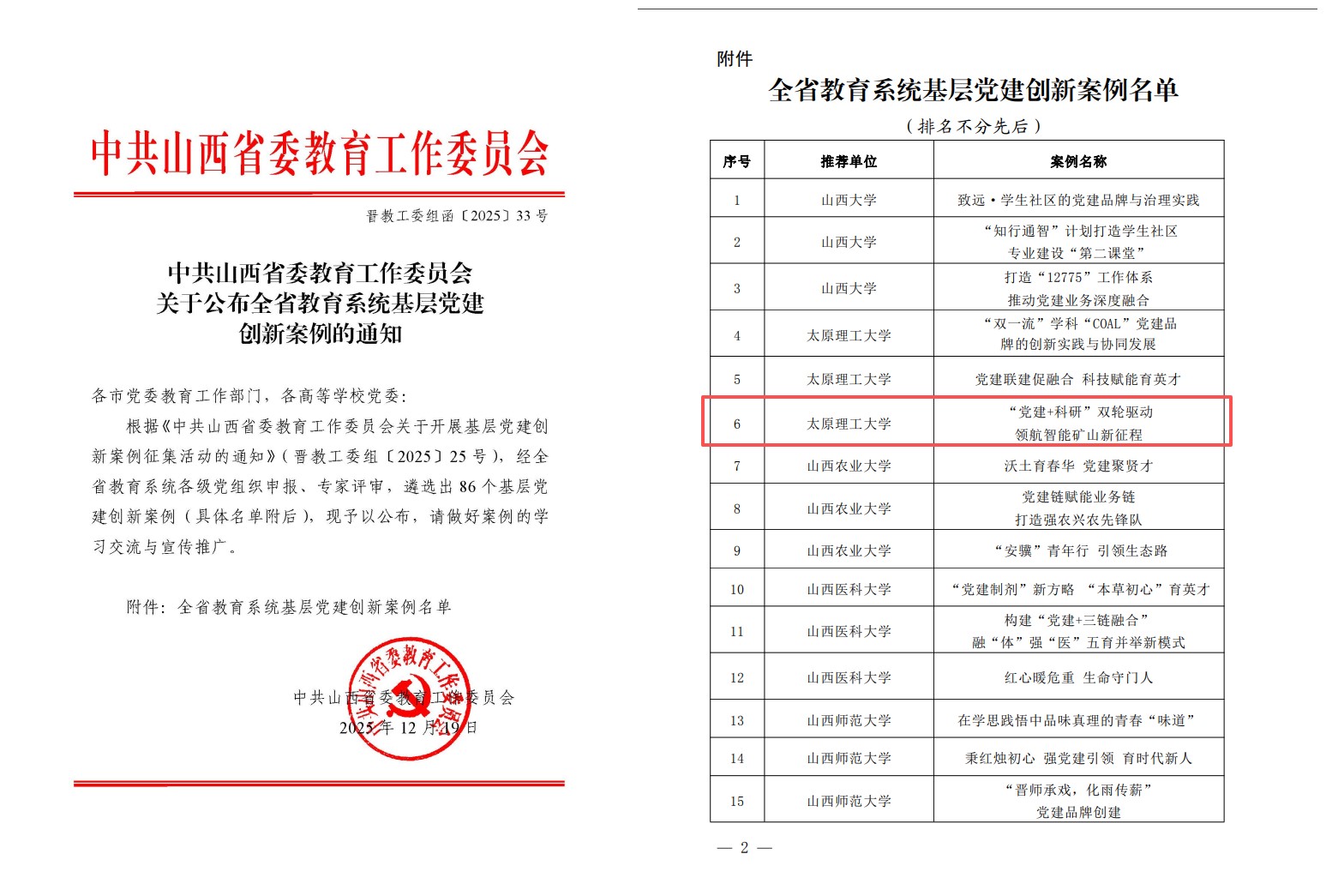 近日,中共山西省委教育工作委员会公布了全省教育系统基层党建创新案例名单,煤矿智能装备中心党支部申报的《“党建+科研”双轮驱动领航智能矿山新征程》成功入选。